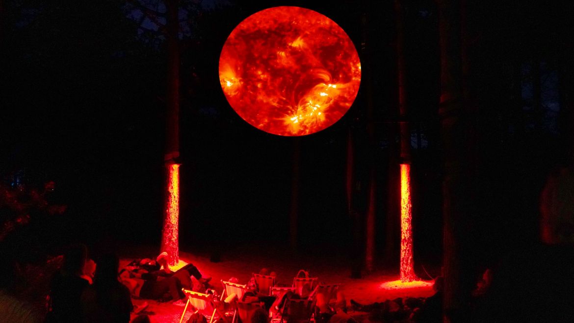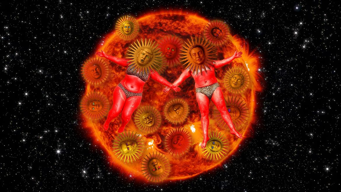 As tech bros and autocrats continue to turn up the heat worldwide, we, like Icarus, fly ever closer to the sun – and yet the daily grind goes on. Through collage and a searing soundscape, inspired by Here Comes the Sun by The Beatles, It’s All Right overwhelms us with the precarity of our time. On a giant mounted disc, lobster-red, sun-kissed bodies drift across the sky. What begins in soothing calm gradually swells into cacophony, erupting through an eight-channel soundscape of AI-generated weather reports, climate protest chants and more. Both overwhelming and unsettling, the installation creates an inescapable sense of urgency: a doomscroll made physical – equally alarming and seductive. We’re going to be all right. Right?